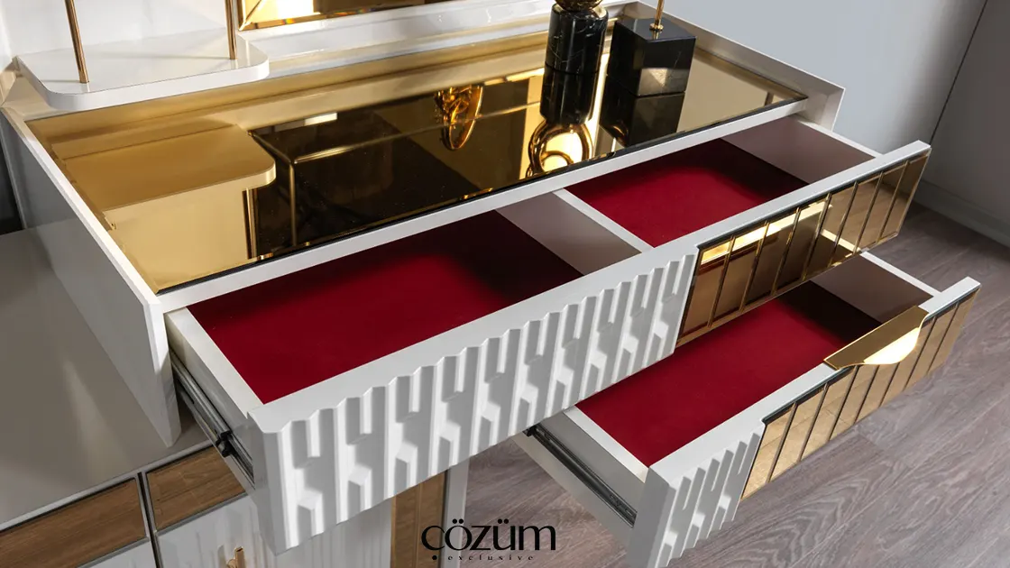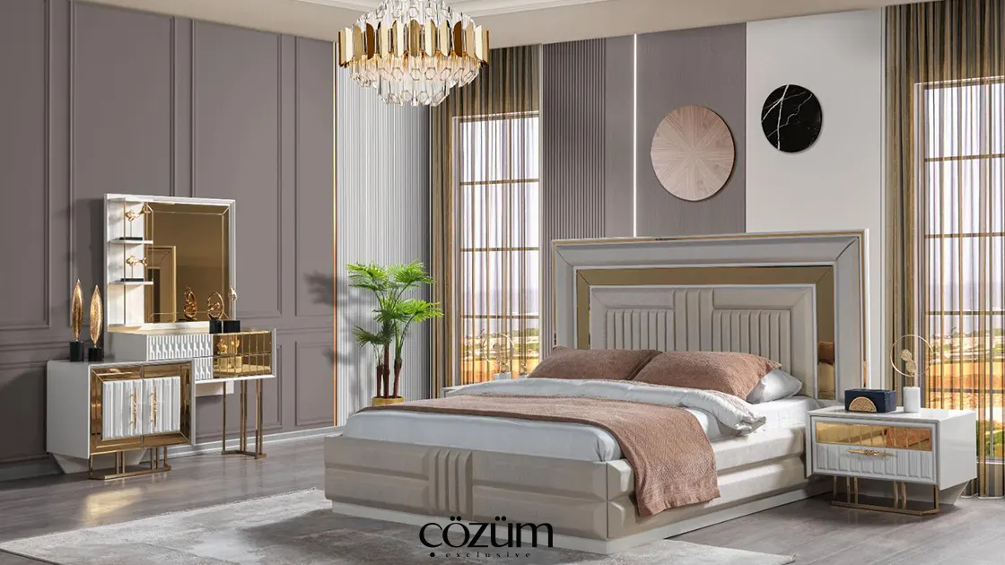 İzmir Kısıkköy Mobilya bölgesinde mobilya alışverişinin önde gelen adreslerinden Çözüm Mobilya, İnci Yatak Odası Takımı ile yatak odalarınıza prestij katıyor. Gold renk detaylarıyla zenginleştirilmiş bu takım, modern tasarımı ve kullanışlı yapısıyla hem estetik hem de pratik bir çözüm sunuyor.